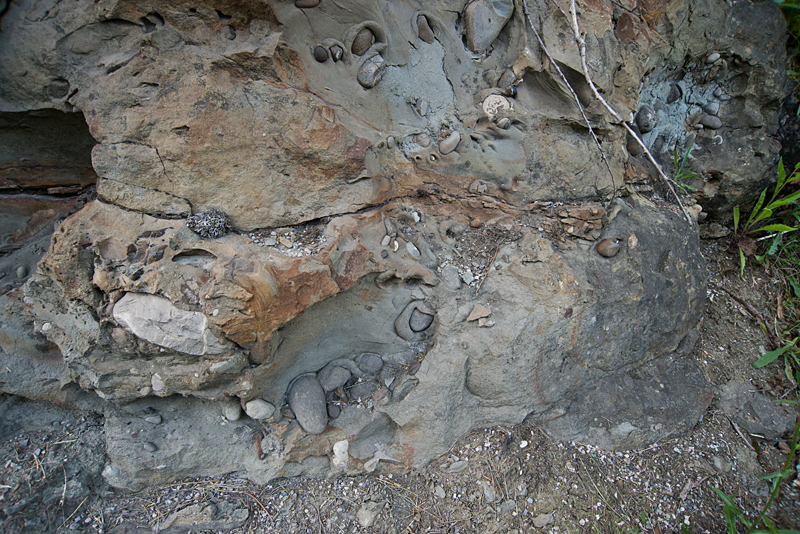 Slika 2. Podkvasto oblikovane teksture – polkrožni centimeter ali dva visoki zaobljeni grebeni, ki obdajajo del prodnika / Potkovasto oblikovane teksture – centimetar ili dva visoki polukružni grebenići obuhvaćaju šljunak, (Naravna vrednota ID 1297, ZRSVN OE Nova Gorica, junij 2007) (Foto: S. Mozetič).