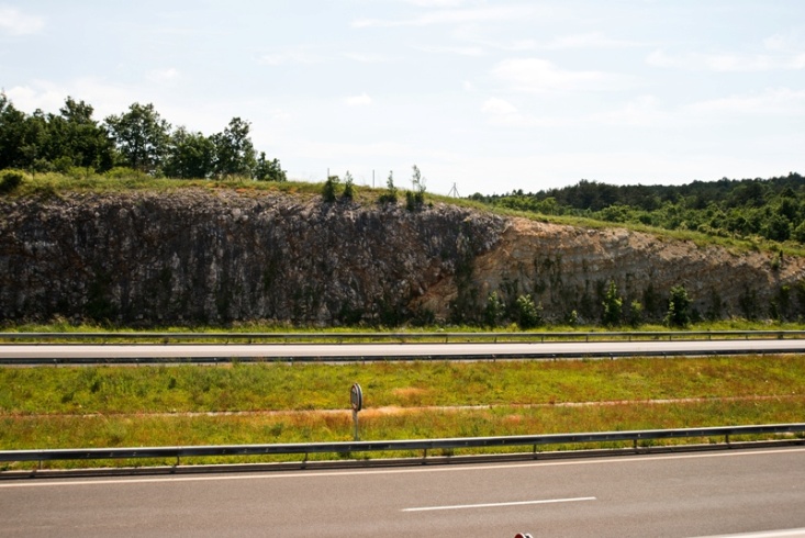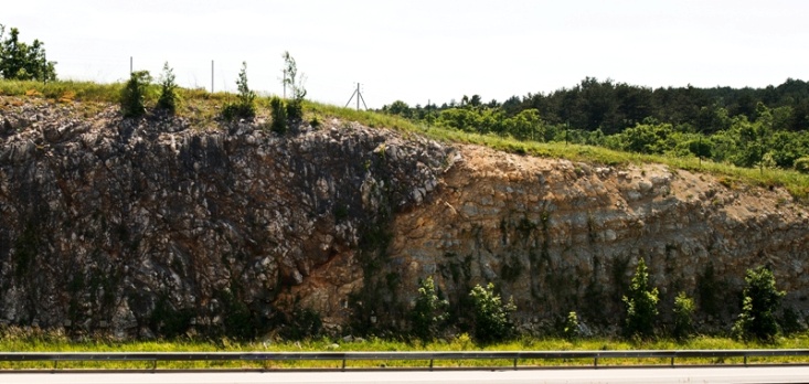 Slika 9. Usek nad zgornjim vhodom avtocestnega predora Kastelec  – dobro viden nariv apnenca na fliš / Ukop iznad gornjeg ulaza u tunel autoputa Kastelec  – dobro vidna navlaka vapnenca prijeko fliša (Foto: S. Mozetič).