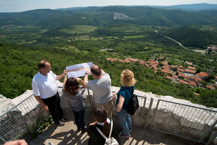 Slika 11. Črni kal (turški stolp) – Črnokalski narivni prelom in panorama kraškega narivnega roba / Črni kal (turski toranj) – Črnokalski navalačni prelom i panorama krškog navalčnog ruba (Foto: S. Mozetič).
