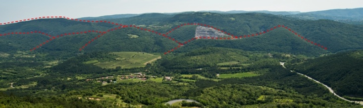Slika 12. Značilna čičarijska luskasta zgradba v dolini Rižane – pogled s turškega stolpa – Črni kal / Karakteristična ljuskava struktura Čičarije u dolini Rižane – pogled s turskog tornja – Črni kal (Foto: S. Mozetič).