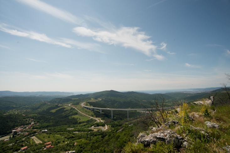 Slika 14. Viadukt Črni kal med flišnim hribovjem na jugu in kraškim robom na severu – preko doline Osapske reke / Viadukt Črni kal između flišnih brda na jugu i krškog ruba na sjeveru – iznad doline Osapske reke (Foto: S. Mozetič).