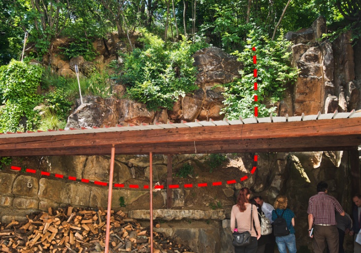 Slika 10. Usek nad zgornjim vhodom avtocestnega predora Kastelec  – nariv apnenca (levo) na fliš (desno) / Ukop iznad gornjeg ulaza u tunel autoputa Kastelec  –navlaka vapnenca (lijevo) prijeko fliša (desno) (Foto: S. Mozetič).